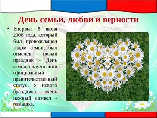 Ежегодно 8 июля отмечается важный российский праздник — День семьи, любви и верности. Символично, что впервые он отмечался в 2008 году, который был объявлен в России годом семьи.