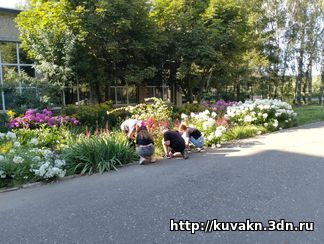 6 и 7 августа ребята наводили порядок на пришкольной территории. Они пропалывали цветники, поливали их, подметали территорию. После окончания работы играли в волейбол.