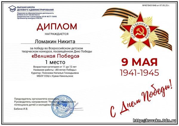 Каблукова Варвара и Ломакин Никита, обучающиеся 4 класса, стали победителями Всероссийского детского творческого конкурса, посвящённого Дню Победы "Великая Победа". Поздравляем их! Молодцы!!!